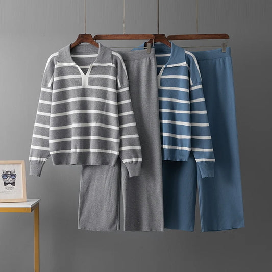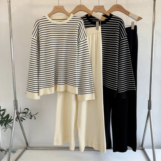 Knitted Two-Piece Matching Sets for Women Loose Trousers Suit Long Sleeve Top Wide Leg Pants Casu...