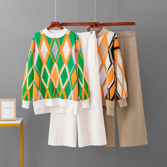 Knitted Two-Piece Matching Sets for Women Loose Trousers Suit Long Sleeve Top Wide Leg Pants Casual Outfits Lozenge Sweater